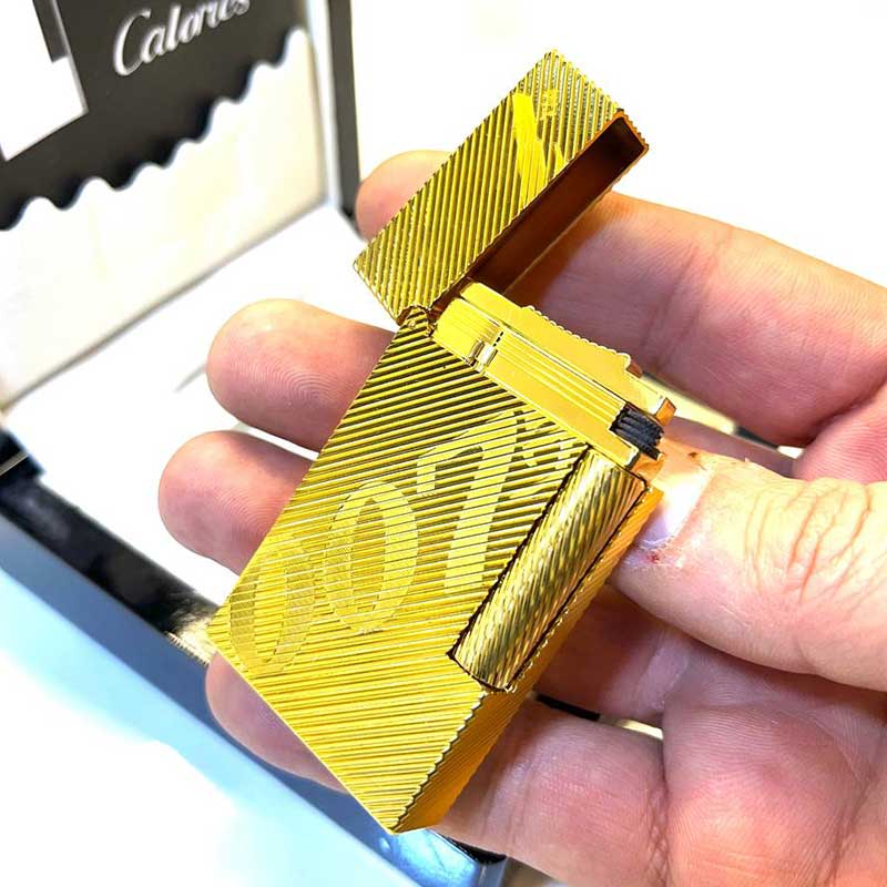 بدنه این فندک لاکچری از فلز با روکش طلایی ساخته شده و عدد ۰۰۷ به‌صورت حکاکی عمیق و دقیق روی آن نقش بسته است. این نوع حکاکی علاوه بر زیبایی بصری، دوام بالایی دارد و با گذشت زمان کیفیت و جلوه خود را حفظ می‌کند. بافت ظریف سطح بدنه در کنار رنگ طلایی، جلوه‌ ای بسیار لوکس و چشمگیر ایجاد کرده است خطوط مورب روی این کار اونو بسیار جذاب و کلکسیونی کرده است.