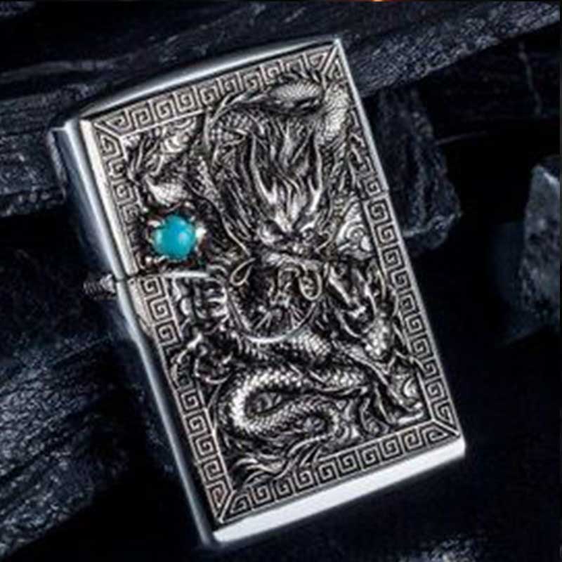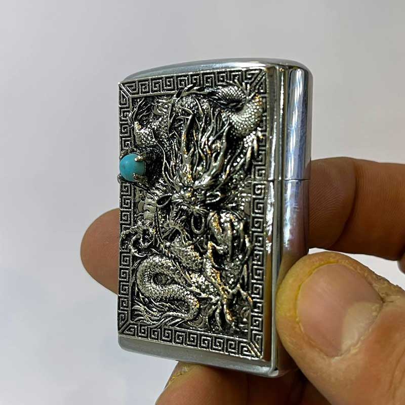 پلاک اژدها با طراحی سه‌بعدی و ظریف روی بدنه حک شده است؛ هر بار که فندک باز می‌شود و بسته می‌شود، بافت و برجستگی فندک حس خوبی در دست ایجاد می‌کند. نگین آبی در مرکز پلاک، نقطه‌ای از تمرکز و درخشش دارد که نمای کار را به کلکسیونی تبدیل می‌کند.
