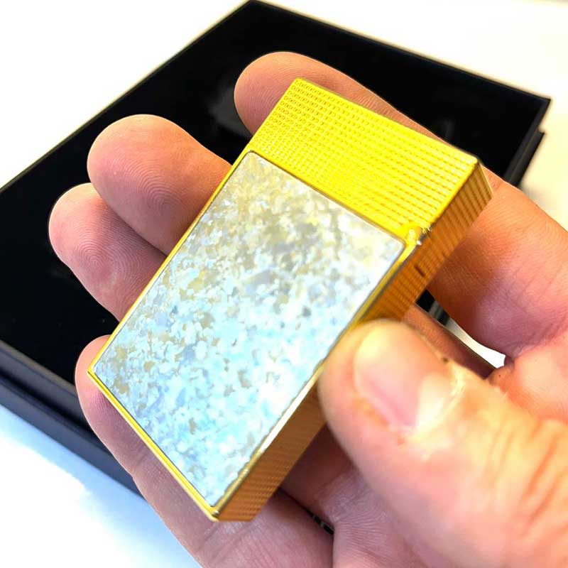 سطح بدنه با الگوی دایموند هد یا تراش الماس پرداخت شده که باعث شکست نور و ایجاد جلوهای خاص و زنده میشود. روکش صدفی در کنار این بافت، ظاهر فندک را از حالت ساده خارج کرده و آن را به یک اکسسوری لوکس و چشمگیر تبدیل کرده است. این نوع پرداخت علاوه بر زیبایی، حس استحکام و کیفیت بالا را در دست منتقل میکند.