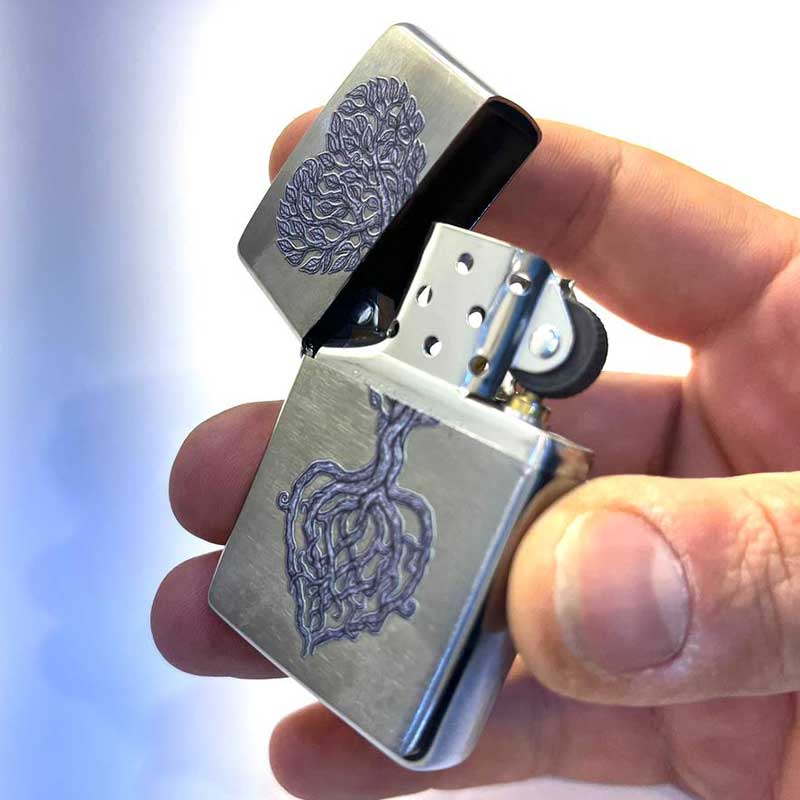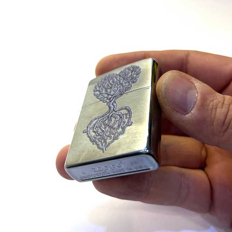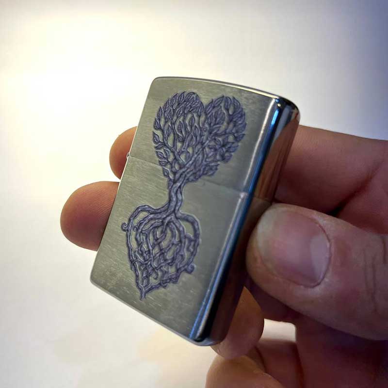 فندک زیپو مدل درخت عشق (Zippo ۴۶۲۳۲) یک ترکیب زیبا از احساس، نمادگرایی و کیفیت ساخت فوق العاده است. بدنه این فندک از فلز با روکش براش کروم (Brushed Chrome) ساخته شده که سطح آن با خطوط ظریف برس خورده، جلوه ای ملایم، مات و در عین حال بسیار مقاوم دارد. این پرداخت براش باعث میشود فندک هم ظاهر لوکس تری داشته باشد و هم در برابر خراشهای سطحی مقاومت بیشتری نشان دهد یک فندک زیپو اور جینال ضد خش که برای مصرف روزانه عالیست.