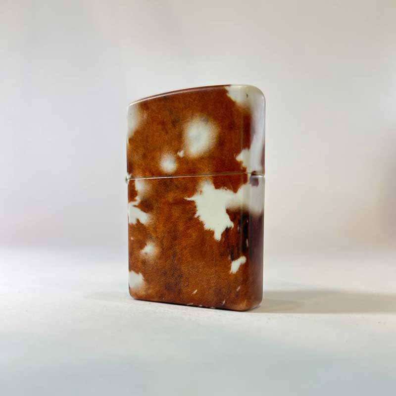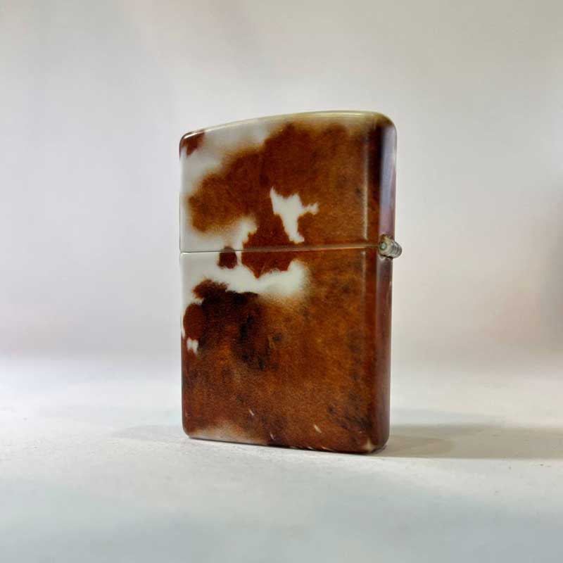 فندک زیپو پوست گاو یکی از طرحهای جسورانه و چشمگیر برند زیپو است که با الهام از پوشش پوست گاو طرحریزی شده است. کل بدنه فندک با تکنیک «540° Color Image» پوشش داده شده است که طرح پوست گاو را بهصورت کامل و اطراف بدنه بازتاب میدهد.