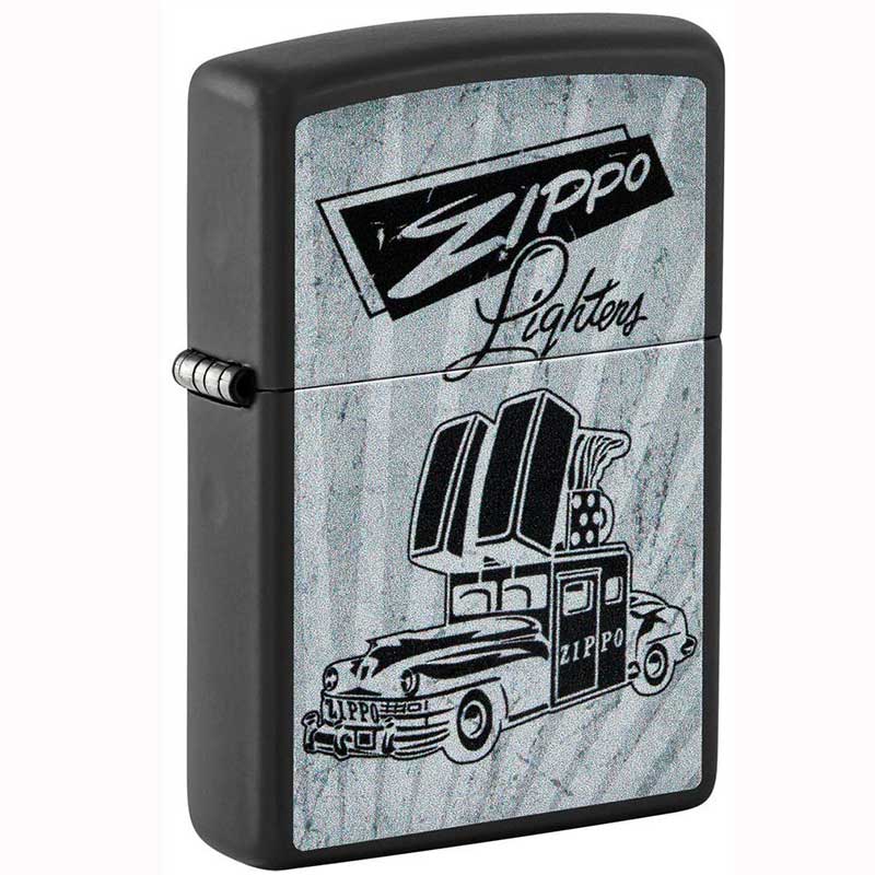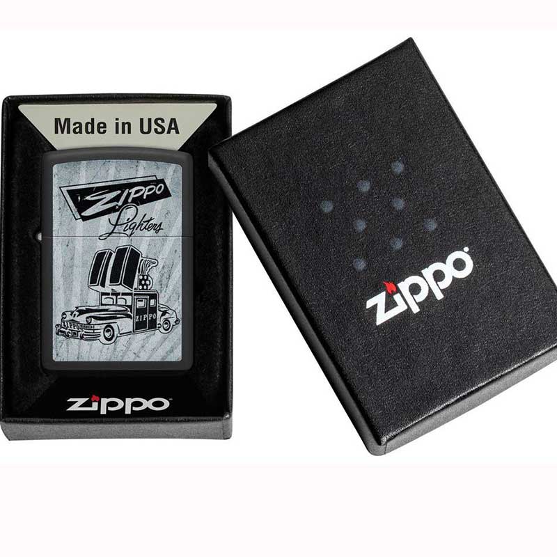 این مدل با بدنه‌ی تمام فلزی و پوشش مشکی مات (Black Matte) ساخته شده و تصویر تبلیغاتی زیبا و نوستالژیک خودرو کلاسیک زیپو روی آن چاپ و حکاکی شده است؛ طرحی که یادآور دوران طلایی طراحی صنعتی و سبک زندگی آمریکایی دهه‌های گذشته است.