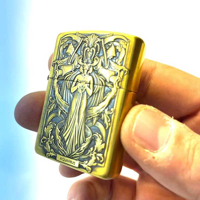 فندک زیپو آکواریوس آرمور کیس طرح Aquarius یکی از مدل های خاص و کلکسیونی Zippo است که با الهام از نماد برج دلو (Aquarius) طراحی شده است. این فندک تولید سال 2020 بوده و به صورت کاستوم ژاپن ماروکایی ساخته شده؛ یعنی مدلی محدود، دقیق و ارزشمند که برای کلکسیونرها طراحی شده است، نه مصرف روزمره.